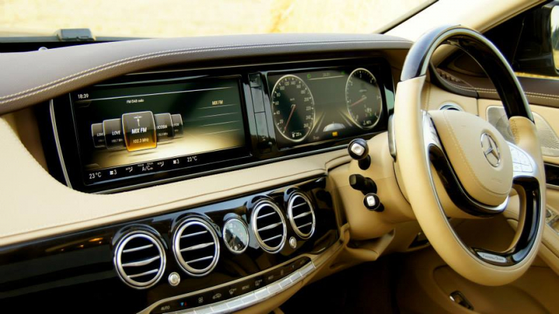 The W223 uses the second-generation Mercedes Benz User Experience (MBUX) infotainment system. It features a 12.3-inch instrument cluster and a 12.8-inch OLED centre infotainment system with haptic feedback. The MBUX system features over-the-air software update support, automatic driver profile selection via voice or fingerprint recognition, and a virtual assistant which activates by saying "Hey Mercedes". The assistant can be controlled by the rear seat passengers and can also control smart home appliances. The car can automatically close the windows and sunroof and recirculate air as it approaches a tunnel or detects poor air quality. Interior cameras can detect driver movements as to automatically lower the rear sunblinds if the driver looks back or switch on the interior light if the driver reaches towards the glovebox. The cameras can detect if a child seat has been installed but the seat belt has not been buckled. The car features 22 cameras and radar sensors for the adaptive cruise control, automatic steering, lane departure warning, emergency braking, and traffic sign recognition. Radar sensors can predict oncoming side collisions and raise the suspension by 8 cm (3.1 in) to direct the crash force towards the doorsills. A SAE Level 3 semi-autonomous driving system is available in Germany since the second half of 2021.